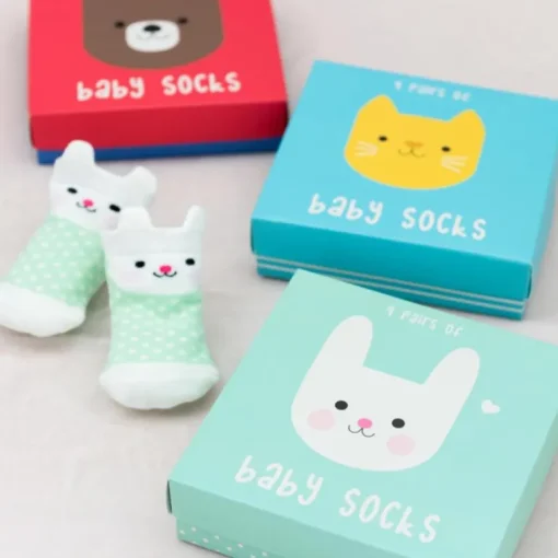 A box of four super cute bear baby socks suitable for newborns. Also available in kitten and bunny designs.