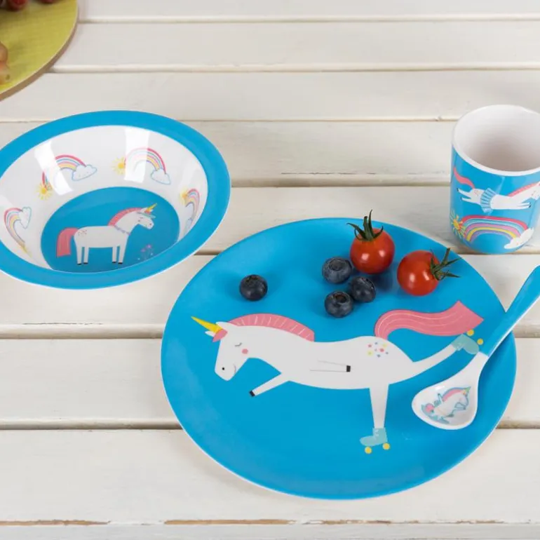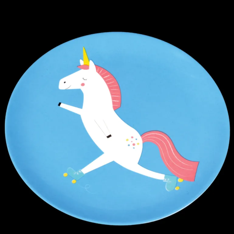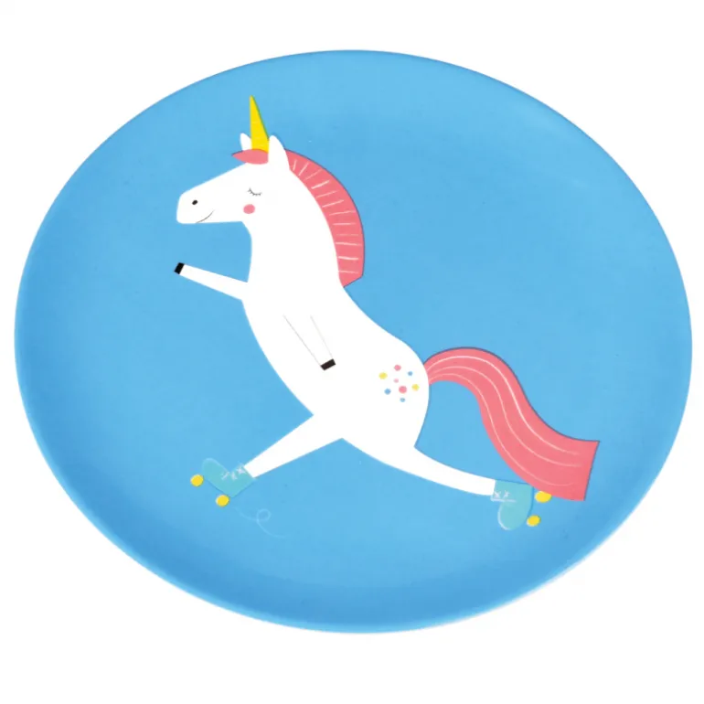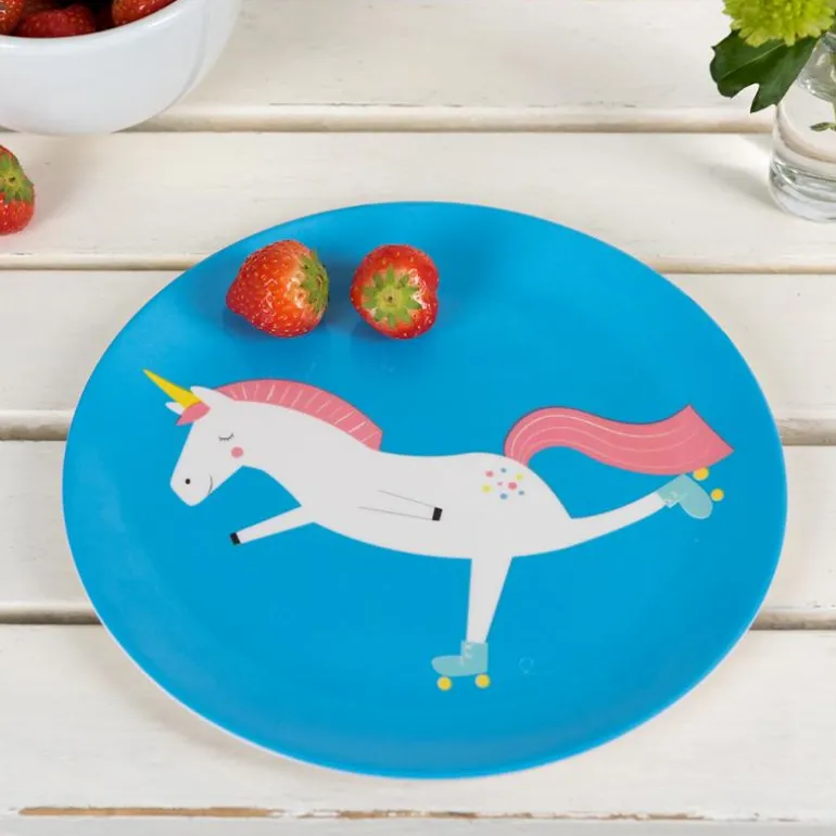 A bright and fun blue melamine plate printed with our fun Magical Unicorn character, perfect for picnics and more!