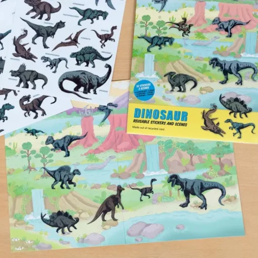 Create endless scenes with this fun dinosaur-themed sticker set for children! Place the reusable dinosaur stickers on the prehistoric landscape and then take them off, rearrange them or add more, as often as you like.