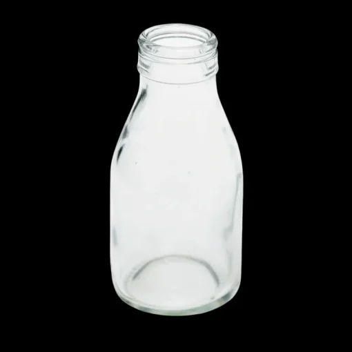 Mini glass vase that resembles a vintage school milk bottle. Embossed lettering on the glass reads “School Milk 1/3 Pint”.